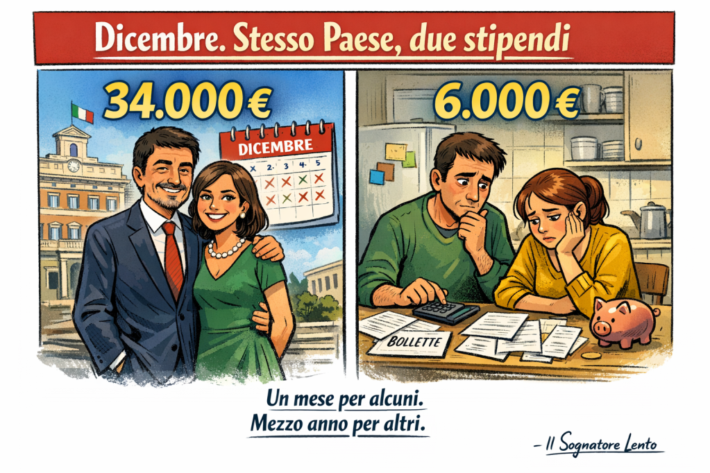 Una coppia istituzionale incassa in un solo mese ciò che una coppia di lavoratori deve accumulare in quasi sei mesi di lavoro. E questo senza considerare imprevisti, malattie, spese straordinarie, figli, mutui.