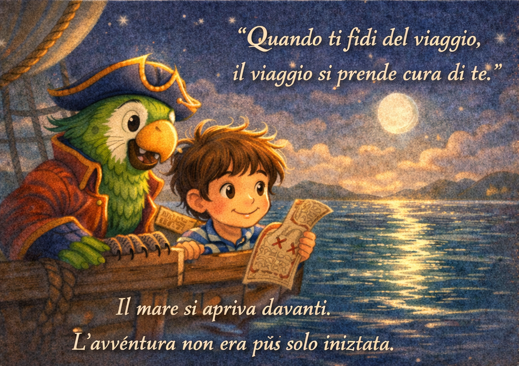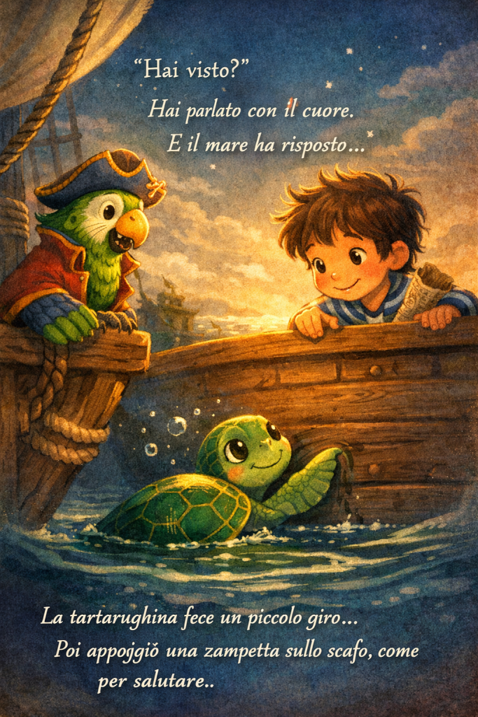 Il vento muoveva le vele, il Vento Blu cantava piano, e il cielo si specchiava nel mare come in uno specchio gigante che non si rompe mai.