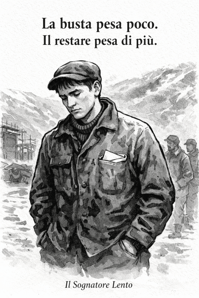 Quella notte dormì meglio. Non perché fosse meno stanco, ma perché il corpo e la testa finalmente andavano nella stessa direzione. Pensò alla lettera che avrebbe preso la strada di casa. Pensò a sua madre che l’avrebbe aperta piano. Pensò a suo padre che non avrebbe detto nulla, ma avrebbe capito tutto.