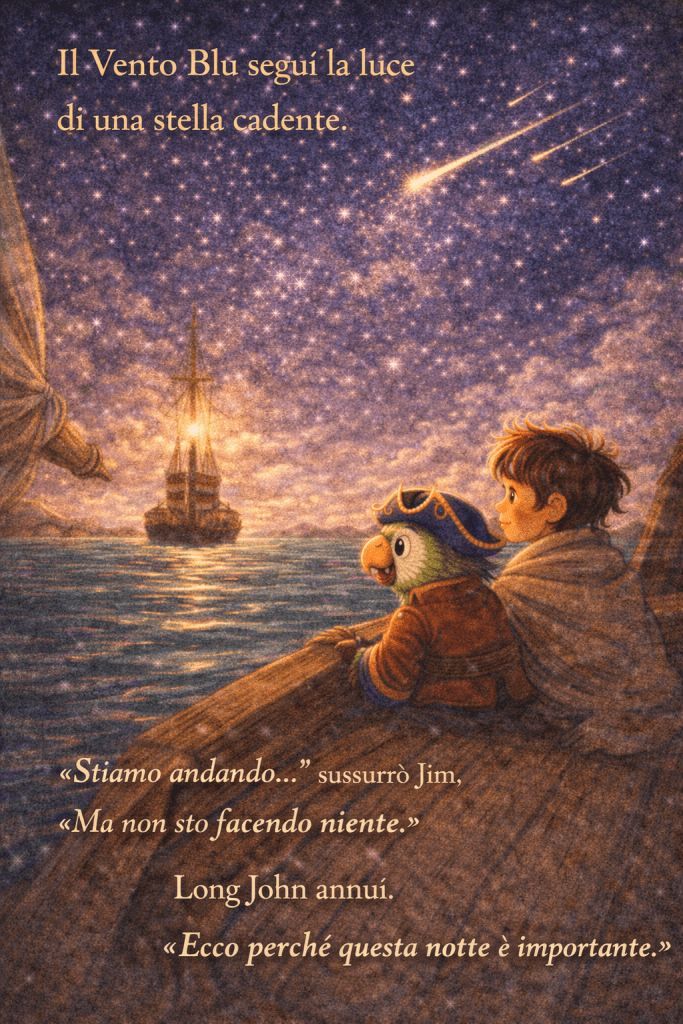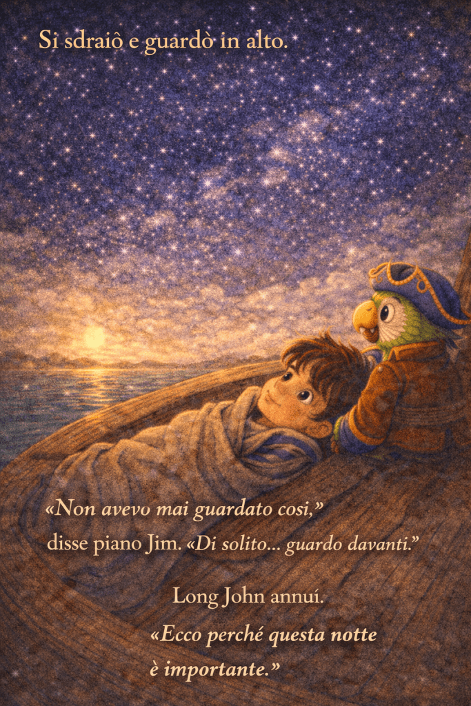 Il cielo cambiò colore poco a poco: dall’azzurro pallido al blu profondo, poi a un viola morbido, finché le prime stelle iniziarono a comparire, una alla volta, come se qualcuno le stesse accendendo con grande attenzione.