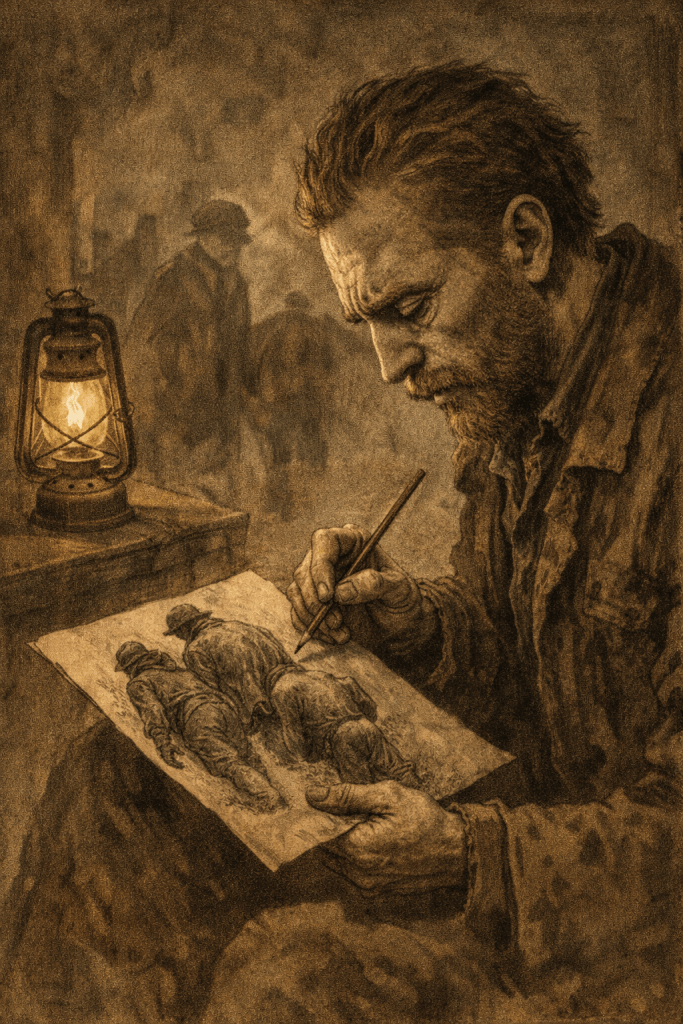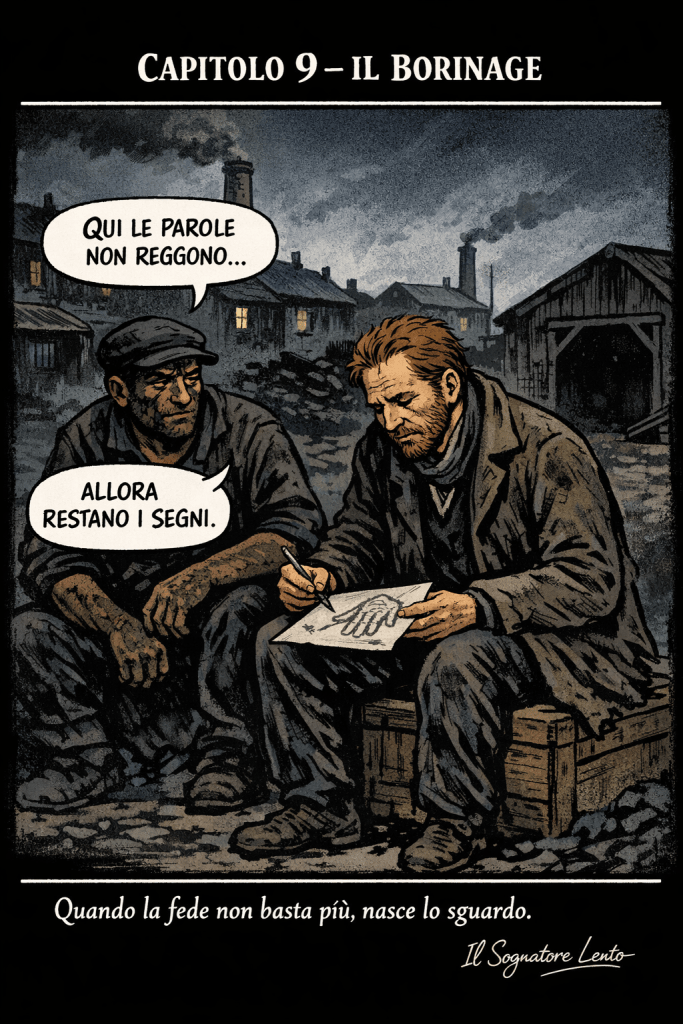 Era la missione protestante che operava tra i minatori del Borinage: un piccolo presidio di fede e disciplina, sostenuto dalla Chiesa riformata, nato per portare conforto, ordine, parole di Vangelo e un po’ di dignità dove la miniera toglieva tutto.