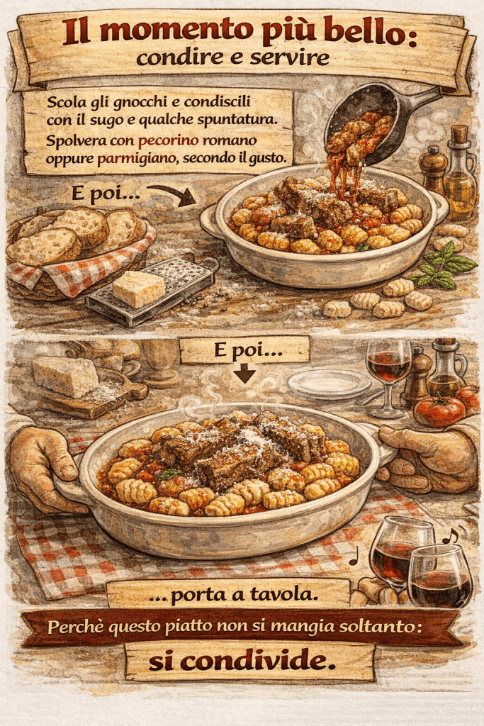 Scola gli gnocchi e condiscili con il sugo e qualche spuntatura.