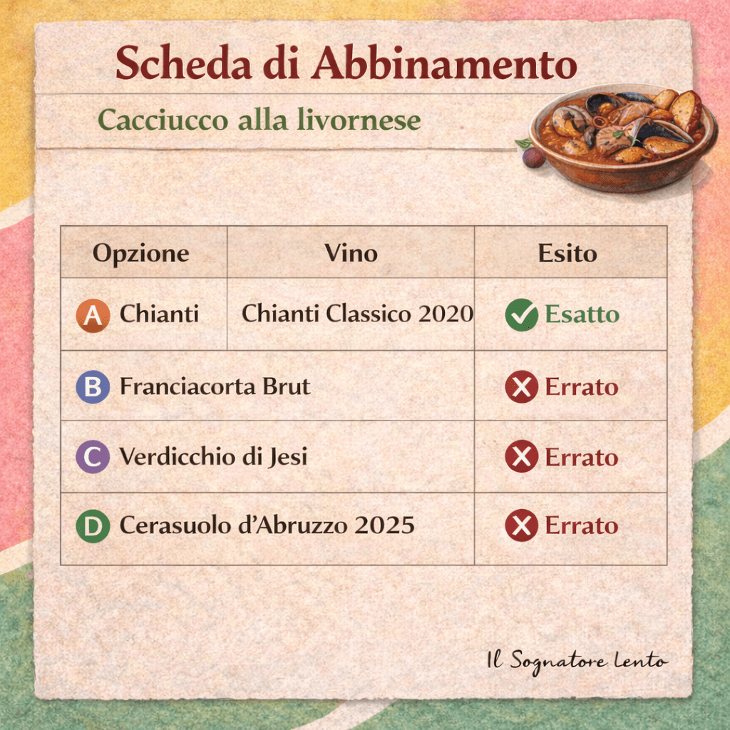 Sebbene il Cerasuolo d’Abruzzo sia un’alternativa tecnica eccellente, la risposta esatta per la tradizione livornese è il Chianti.