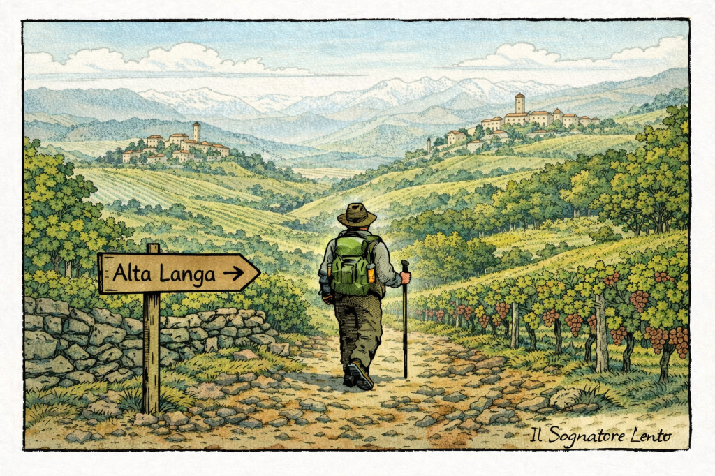 In borghi come Bossolasco o Murazzano, l’aria è diversa: arriva dalle Alpi e già profuma di mare. Sui terreni calcarei, tra i muretti a secco, il Pinot Nero e lo Chardonnay trovano una casa austera. L’Alta Langa non ha fretta: chiede anni di buio in cantina per diventare spumante sapido, minerale, croccante. È la tappa della solitudine e della vista larga. Cammini sul crinale del mondo, capendo che la vigna è solo una parte di un equilibrio più grande.